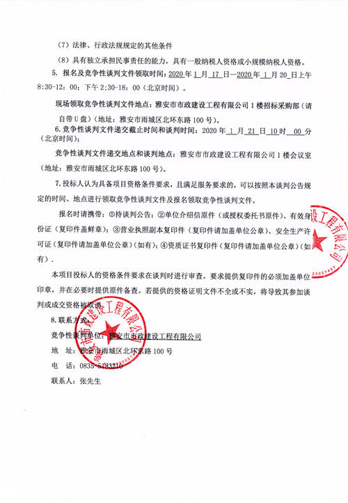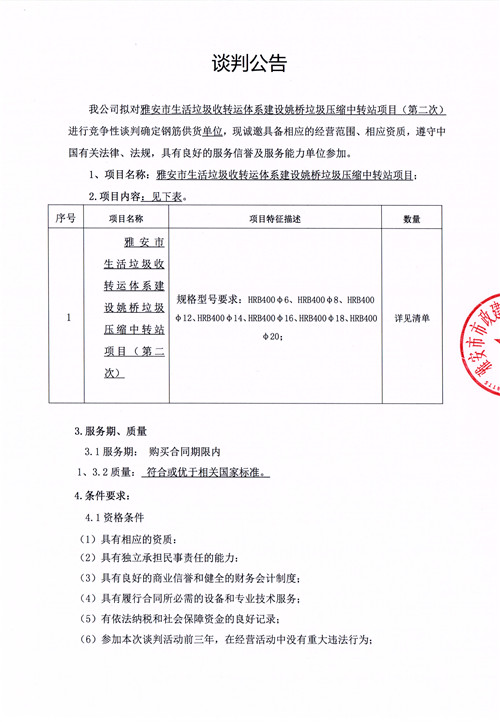 雅安市生活垃圾轉(zhuǎn)運(yùn)體系建設(shè)姚橋垃圾壓縮中轉(zhuǎn)站項目確定鋼筋供貨單位的競爭性談判公告(第二次)