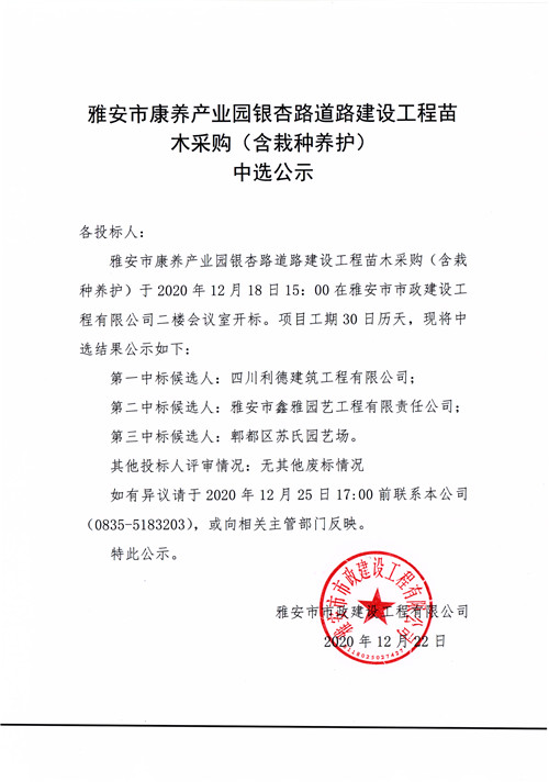 雅安市康養(yǎng)產(chǎn)業(yè)園銀杏路道路建設工程苗木采購(含栽種養(yǎng)護)中選公示