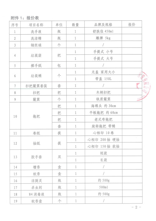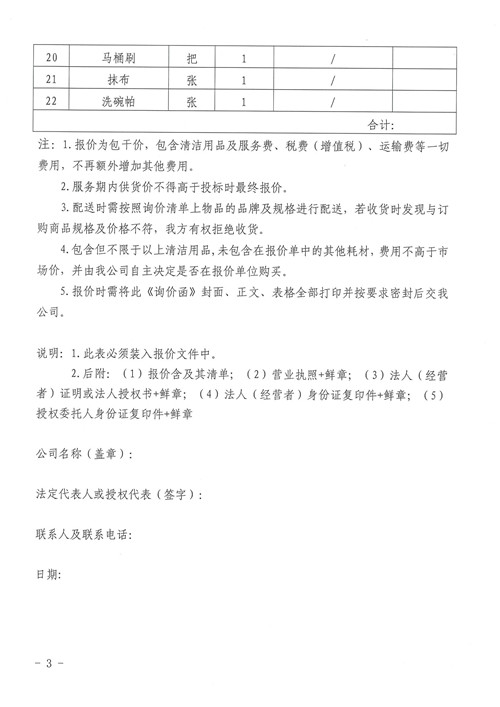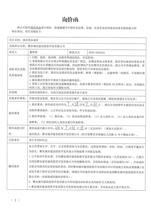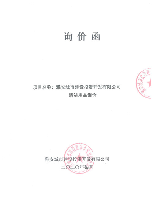 雅安城市建設投資開發(fā)有限公司清潔用品詢價函