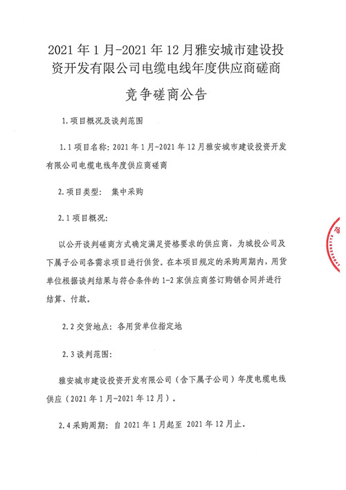 2021年1月-2021年12月雅安城市建設(shè)投資開(kāi)發(fā)有限公司電纜電線年度供應(yīng)商磋商競(jìng)爭(zhēng)磋商公告