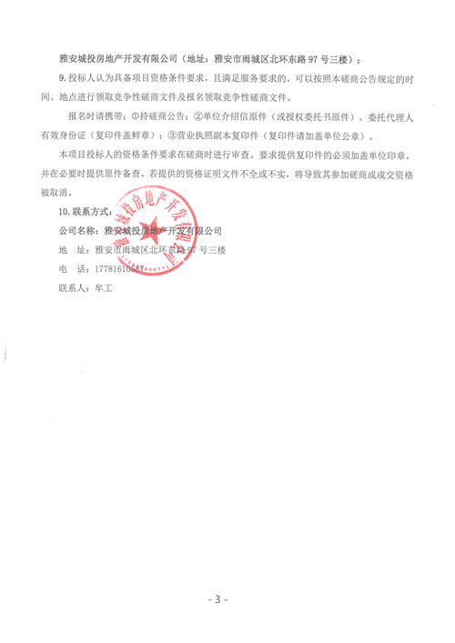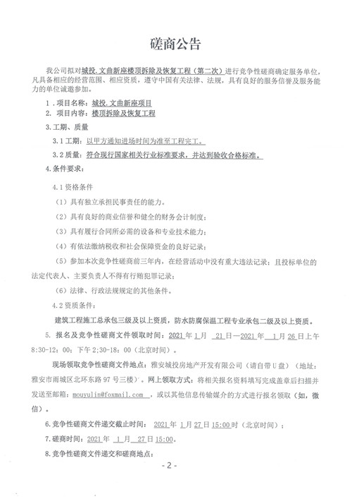 雅安城投房地產(chǎn)開發(fā)有限公司城投·文曲新座樓頂拆除及恢復工程(第二次)競爭性磋商公告