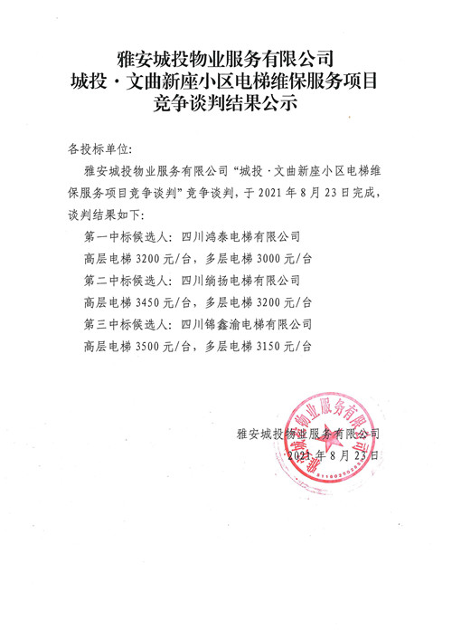 城投物業(yè)公司城投·文曲新座小區(qū)電梯維保服務項目競爭談判結(jié)果公示