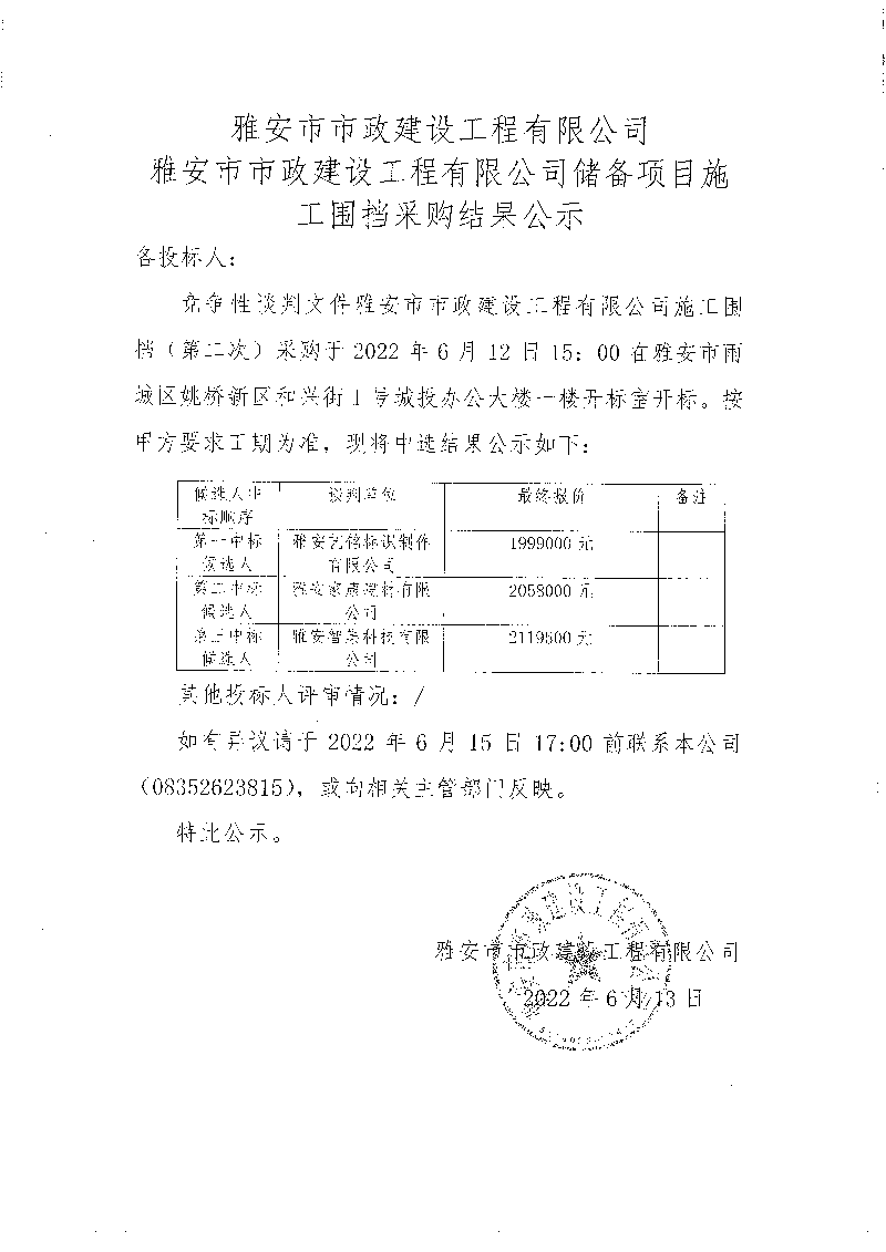 雅安市市政建設(shè)工程有限公司儲備項(xiàng)目施工圍擋招采結(jié)果公示