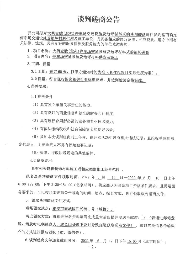 大興壹號(hào)(北苑)停車場(chǎng)交通設(shè)施及地坪材料采購(gòu)談判磋商公告
