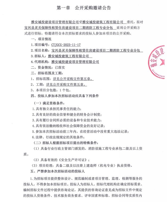 寶興縣靈關(guān)保障性租賃住房建設(shè)項目二期消防工程專業(yè)分包公開采購邀請公告