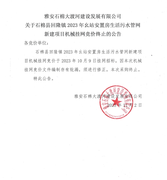 雅安石棉大渡河建設(shè)發(fā)展有限公司關(guān)于石棉縣回隆鎮(zhèn)2023年幺站安置房生活污水管網(wǎng)新建項(xiàng)目機(jī)械掛網(wǎng)競(jìng)價(jià)終止的公告