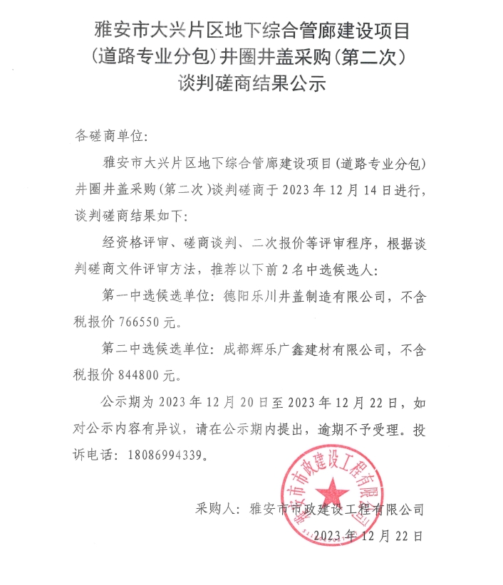 雅安市大興片區(qū)地下綜合管廊建設(shè)項(xiàng)目(道路專業(yè)分包)井圈井蓋采購(gòu)(第二次)談判磋商結(jié)果公示