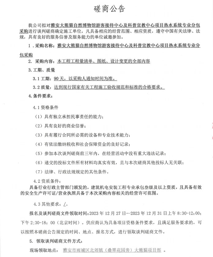 雅安大熊貓自然博物館游客接待中心及科普宣教中心項(xiàng)目熱水系統(tǒng)專業(yè)分包采購談判磋商公告