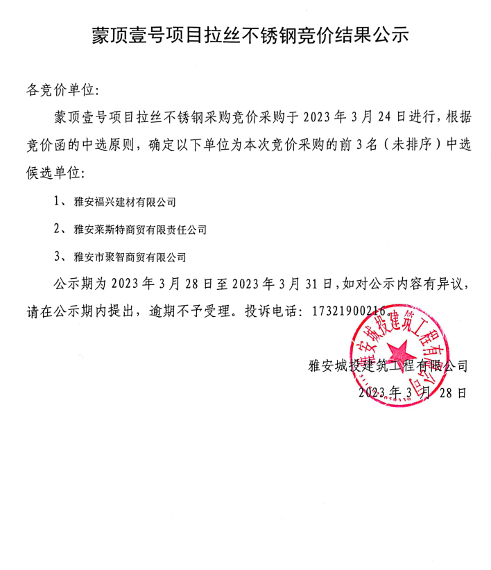 蒙頂壹號(hào)項(xiàng)目拉絲不銹鋼競(jìng)價(jià)結(jié)果公示