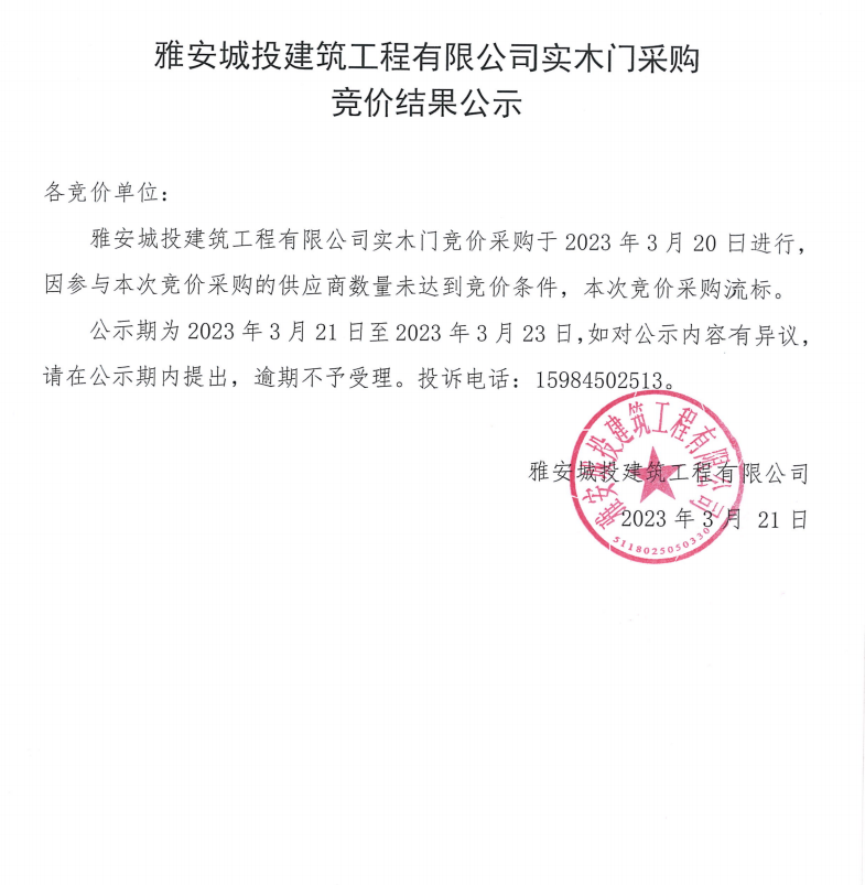 雅安城投建筑工程有限公司實木門采購競價結果公示