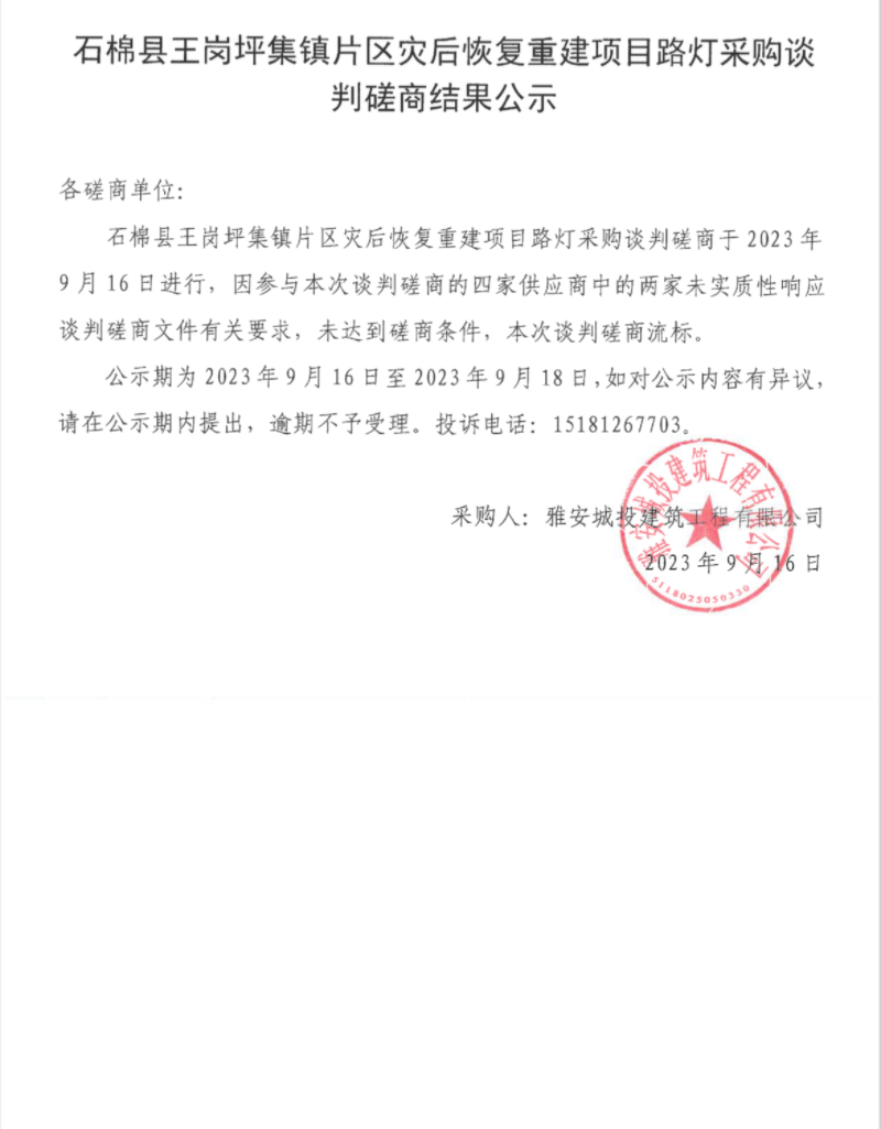 石棉縣王崗坪集鎮(zhèn)片區(qū)災后恢復重建項目路燈采購談判磋商結果公示