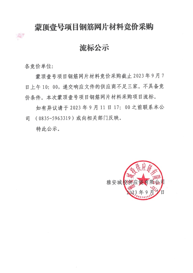 蒙頂壹號項目鋼筋網(wǎng)片材料競價采購流標公示