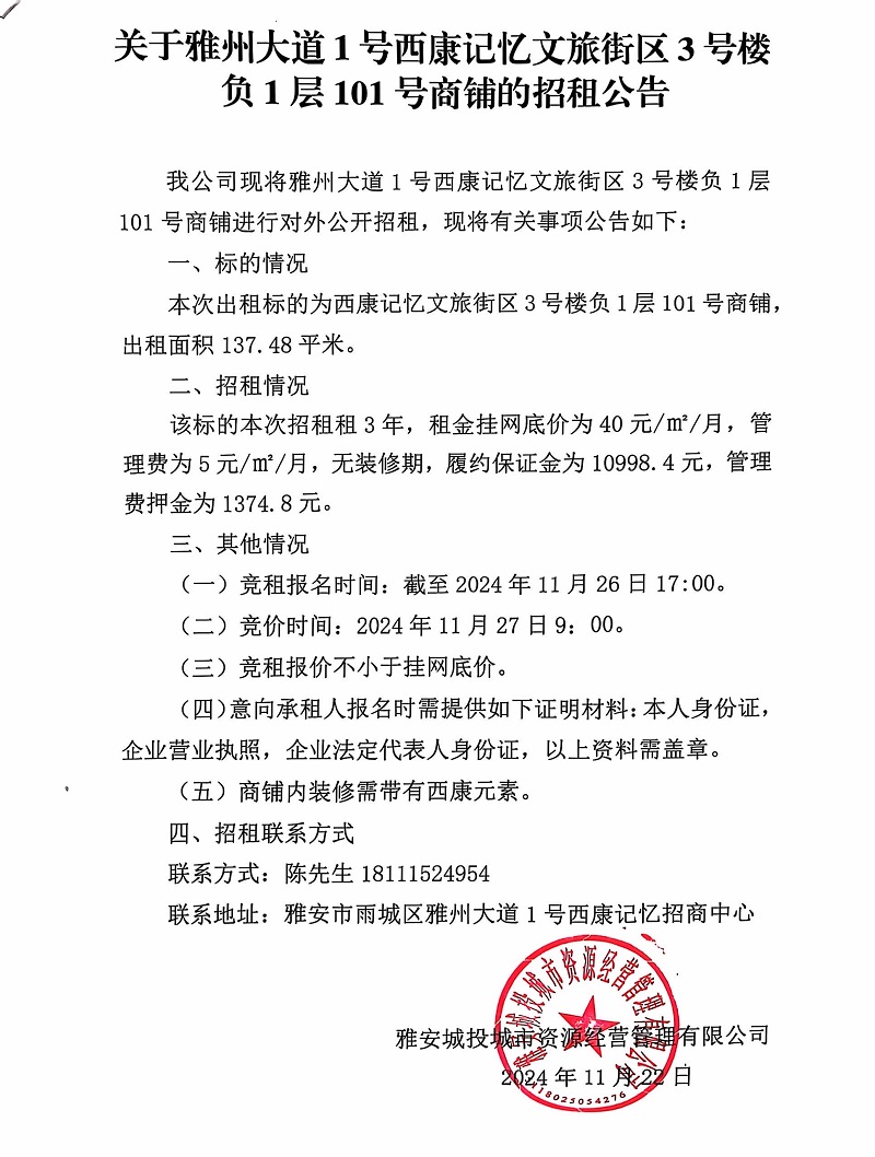關(guān)于雅州大道1號西康記憶文旅街區(qū)3號樓負(fù)1層101號商鋪的招租公告