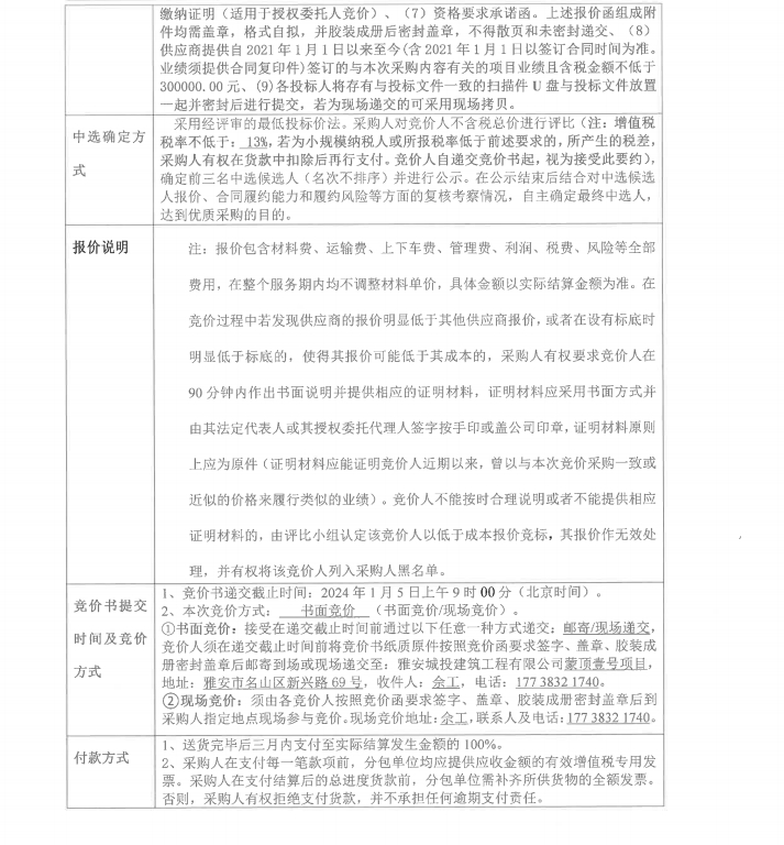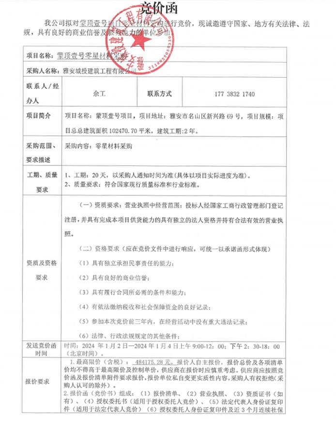 蒙頂壹號零星材料采購競價公告