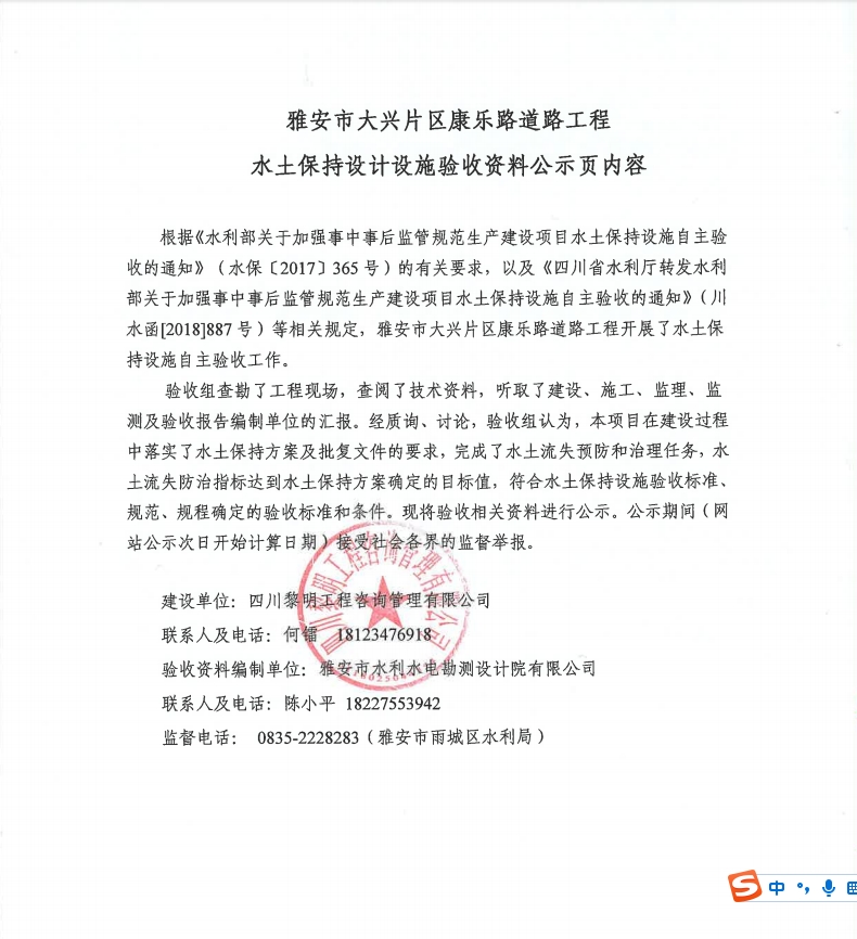 雅安市大興片區(qū)康樂路道路工程水土保持設計設施驗收資料公示頁內容