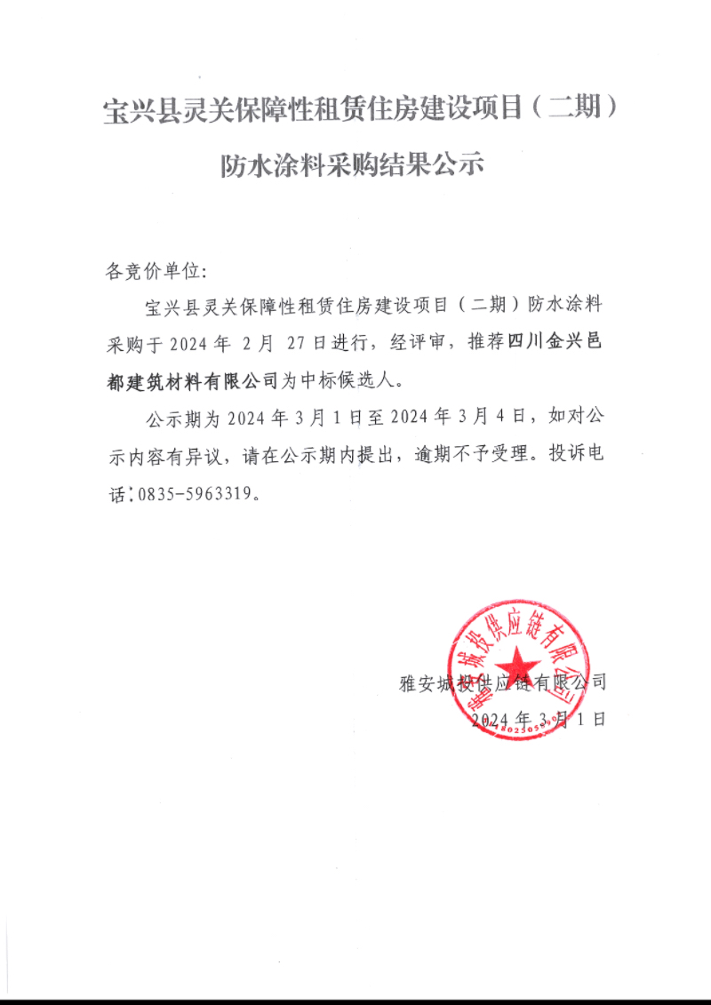 寶興縣靈關(guān)保障性租賃住房建設(shè)項(xiàng)目(二期)防水涂料采購(gòu)結(jié)果公示