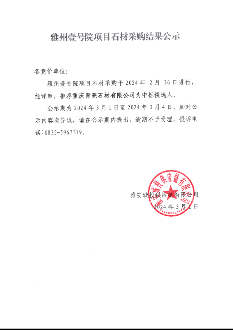 雅州壹號院項(xiàng)目石材采購結(jié)果公示