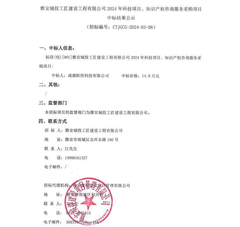 雅安城投工匠建設(shè)工程有限公司2024年科技項目、知識產(chǎn)權(quán)咨詢服務(wù)采購項目中標結(jié)果公示