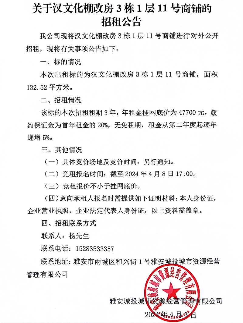 關于漢文化棚改房3棟1層11號商鋪的招租公告