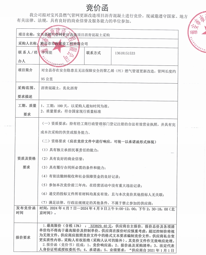 寶興縣燃?xì)夤芫W(wǎng)更新改造項目瀝青混凝土競價公告