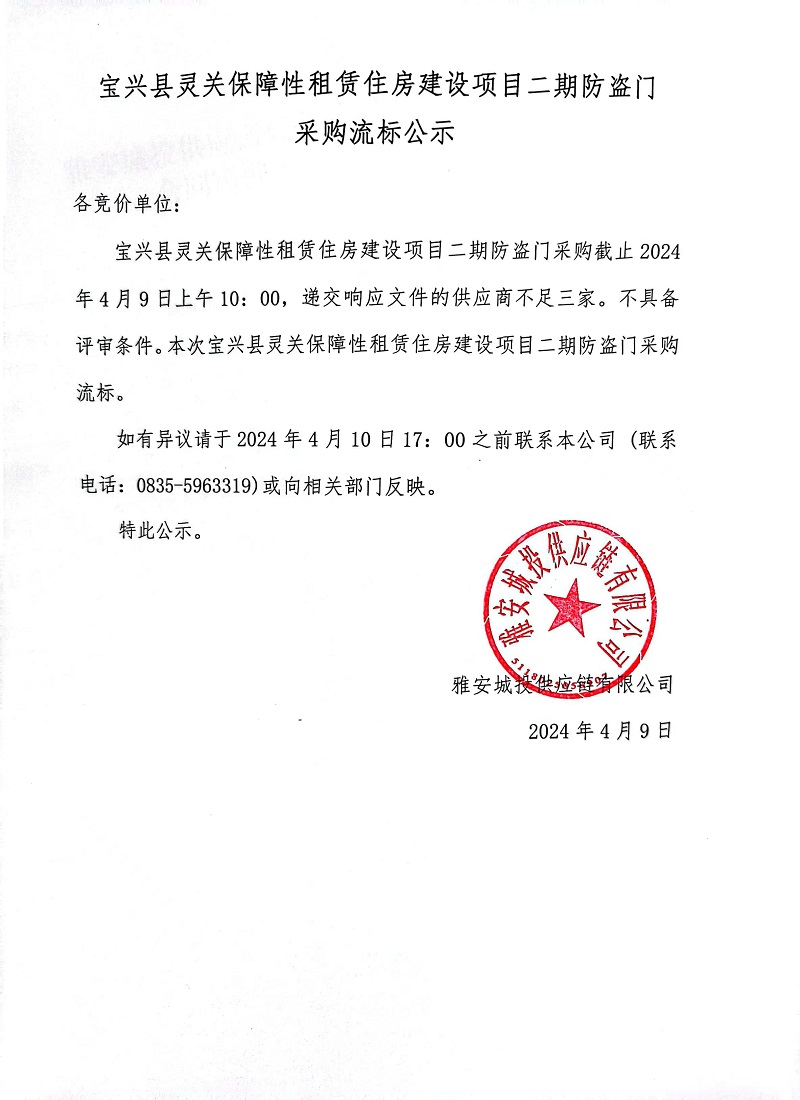 寶興縣靈關(guān)保障性租賃住房建設(shè)項(xiàng)目二期防盜門采購(gòu)流標(biāo)公示