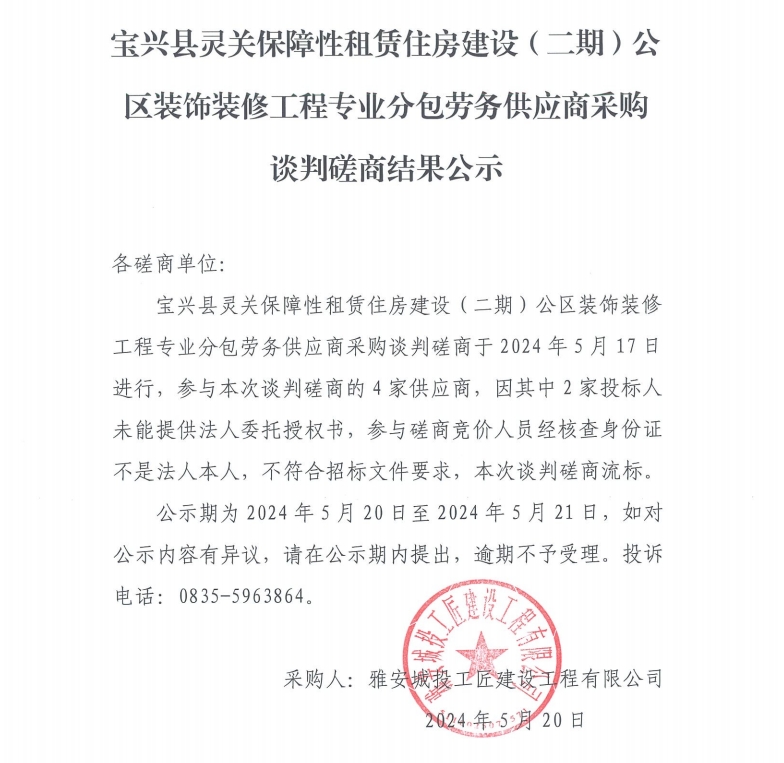 寶興縣靈關保障性租賃住房建設(二期)公區(qū)裝飾裝修工程專業(yè)分包勞務供應商采購談判磋商結果公示