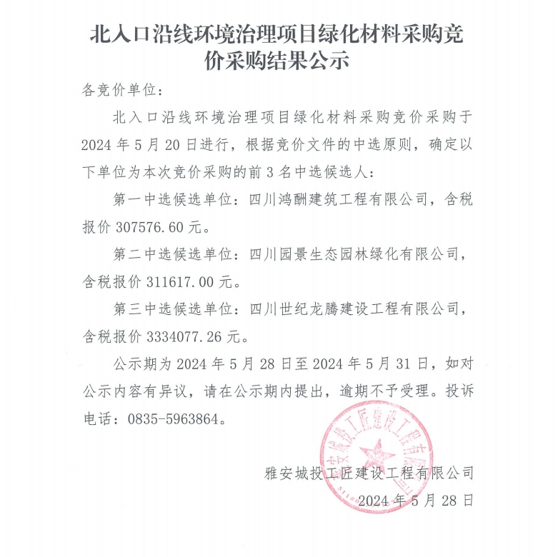 北入口沿線環(huán)境治理項目綠化材料采購競價采購結(jié)果公示