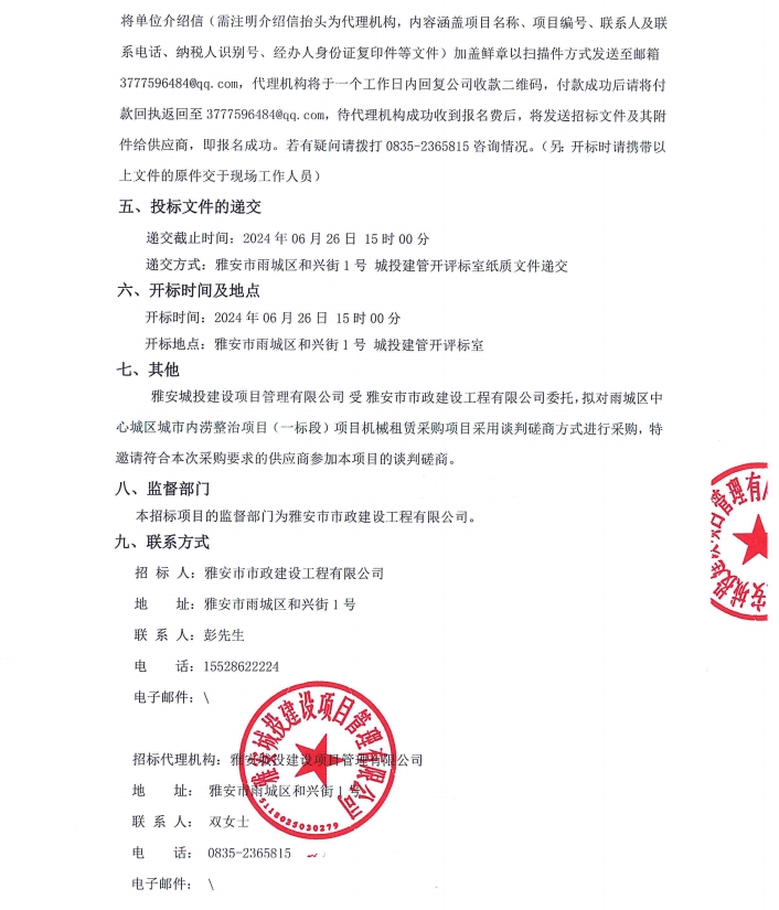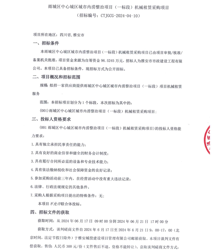 雨城區(qū)中心城區(qū)城市內(nèi)澇整治項(xiàng)目(一標(biāo)段)項(xiàng)目機(jī)械租賃采購(gòu)項(xiàng)目招標(biāo)公告