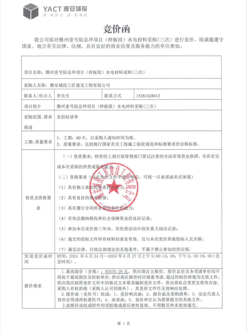 雅州壹號(hào)院總坪項(xiàng)目(樣板段)水電材料采購(三次)競(jìng)價(jià)公告
