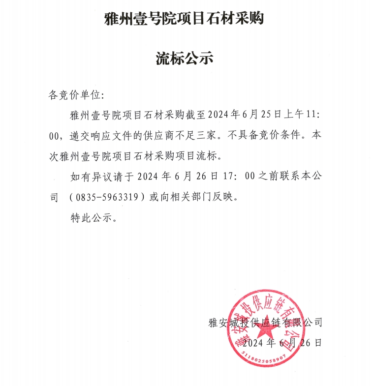 雅州壹號(hào)院項(xiàng)目石材采購流標(biāo)公示