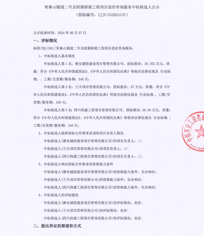 青鼻山隧道二號(hào)及附屬橋梁工程項(xiàng)目造價(jià)咨詢(xún)服務(wù)中標(biāo)候選人公示