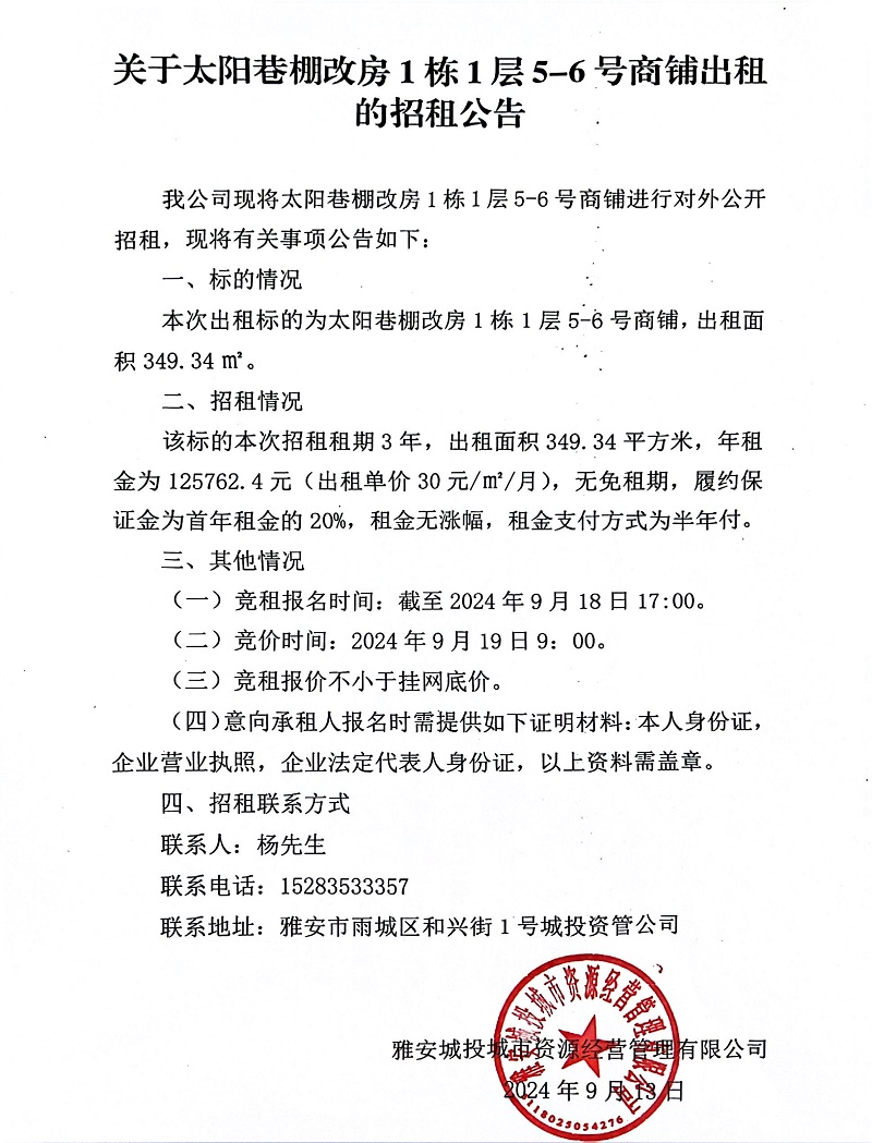 關(guān)于太陽巷棚改房1棟1層5-6號商鋪出租的招租公告
