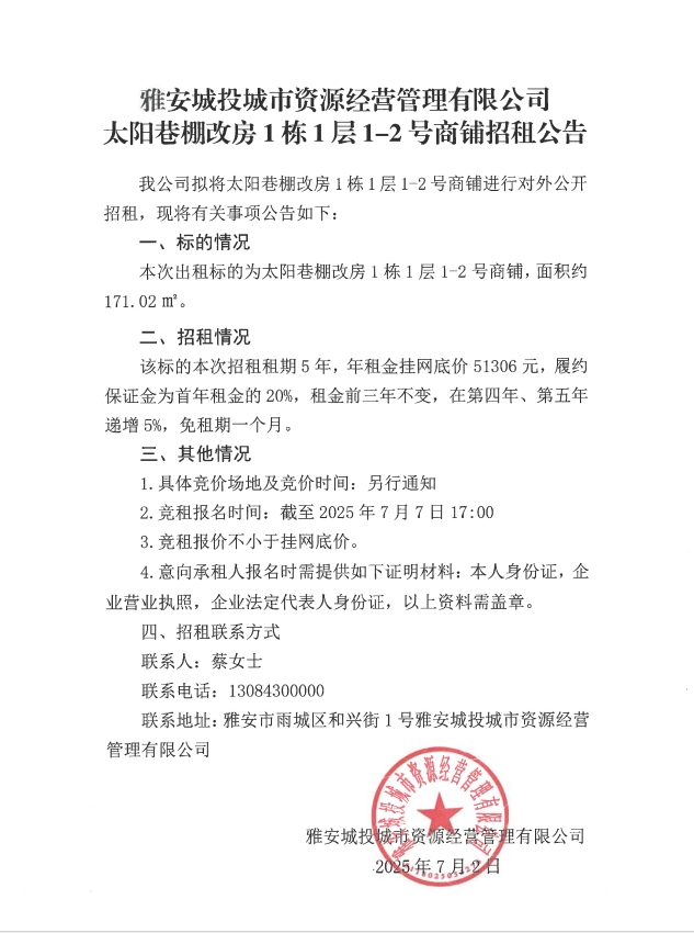 太陽巷棚改房1棟1層1-2號商鋪招租公告