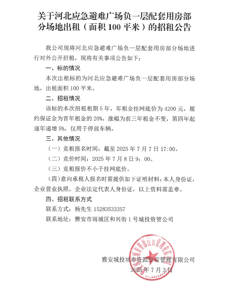 關(guān)于河北應(yīng)急避難廣場負一層配套用房部分場地出租(面積100平米)的招租公告