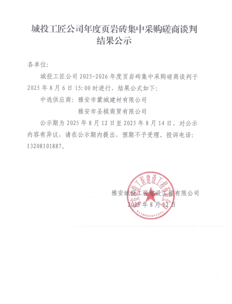 城投工匠年度頁(yè)巖磚集中采購(gòu)磋商談判結(jié)果公示