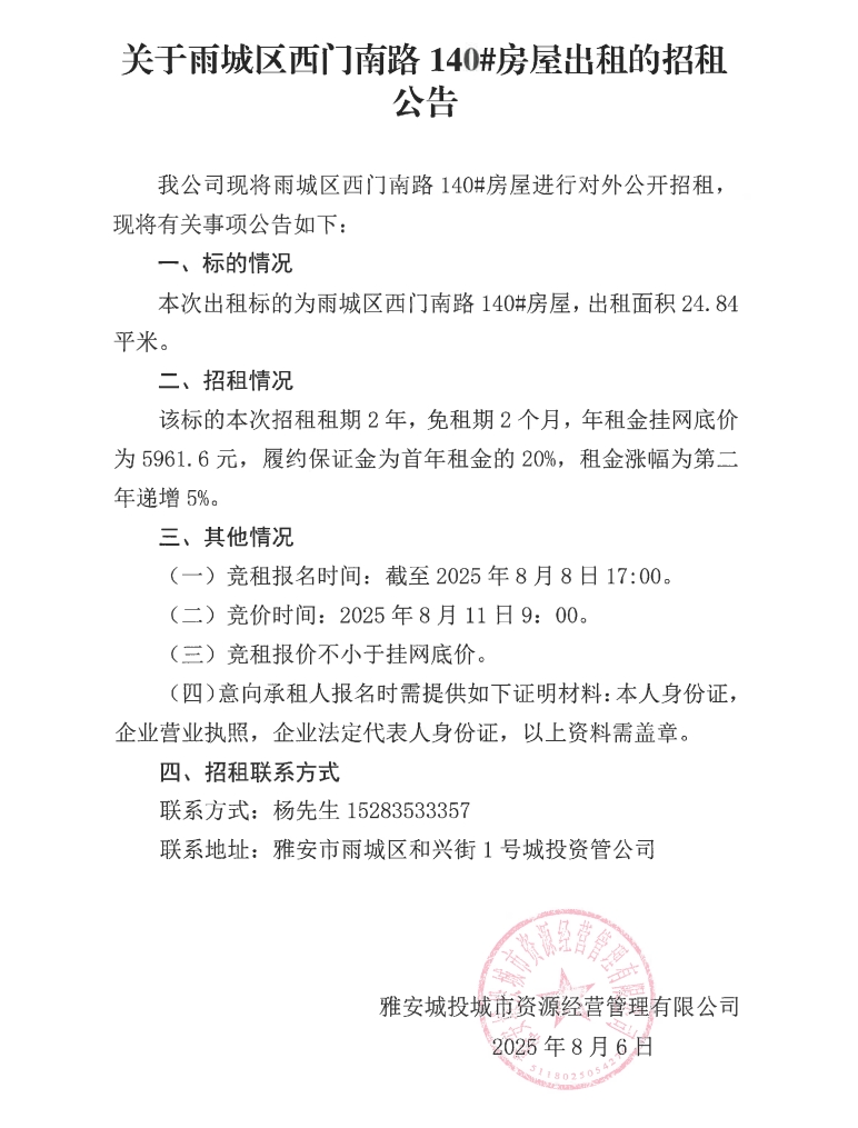 關于雨城區(qū)西門南路140#房屋出租的招租公告