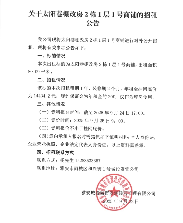 關于太陽巷棚改房2棟1層1號商鋪的招租公告